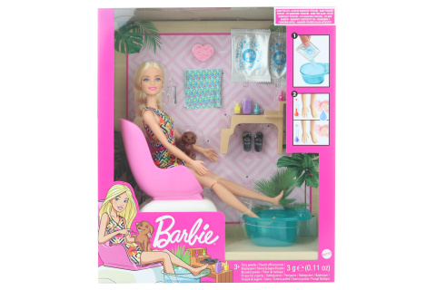 Panenka Barbie® ví, že je důležité o sebe pečovat. Připoj se k panence Barbie® a jejímu štěňátku a nechte se rozmazlovat v nehtovém studiu. Usaď panenku Barbie® do židle a ponoř její chodidla do vodní lázně. Naplň lázeň vodou a přidej jeden ze dvou šumivých sáčků. Co by to bylo za pedikúru bez lakování nehtů. Použij houbu a vodu a změň barvu jejích nehtů. Nezapomeň ani na nehty na rukou. Na dřevěné lavici najdeš všechny potřeby na manikúru a pedikúru a dokonce je tu i dostatek místa pro panenčino štěňátko. Panenka se při této příležitosti oblékla do pohodlného domácího oblečku a pohodlných botek.