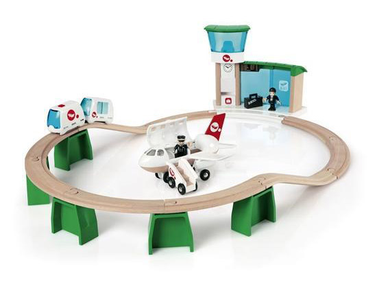 Jednokolejná nadzemní letištní dráha je kompatibilní se všemi vlaky a traťemi BRIO. Letištní nadzemka dopraví cestující z terminálu k letadlu. Součástí balení je motorizovaný vláček letadlo s vyklápěcí střechou jezdící schodiště figurka pilota a cestujícího.