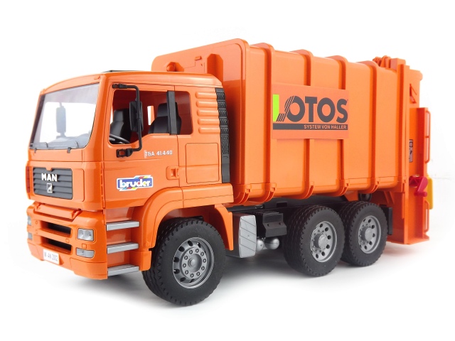 Popelářské auto Man oranžové barvy. Dvě popelnice. Možnost nakladání, drcení odpadu, posuvu do vnitřní časti a vyklápění nákladu.