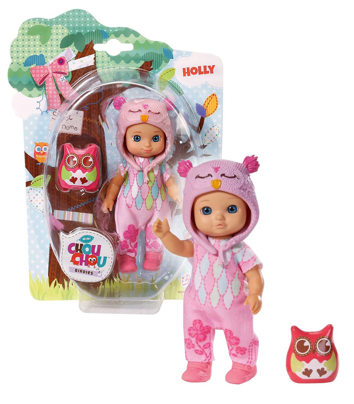 Roztomilá mini panenka CHOU CHOU HOLLY je tady! Panenka o velikosti 12 cm je typická díky své čepičce ve tvaru soví hlavičky. Součástí balení je i malá sovička v barvě, která ladí s oblečkem a čepičkou panenky.