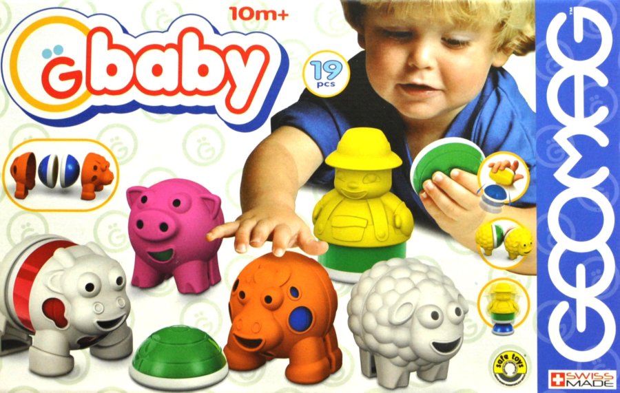 Stavebnice GEOMAG Baby - Velká farma obsahuje 10 plastových magnetických dílků (8x polokoule, 2x válec), 8 komponentů k sestavení 4 zvířátek a 1 postavičku farmáře. Stavebnice je vhodná pro děti od 10 měsíců.