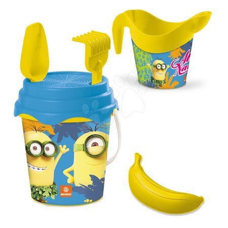 Set kbelíku a nástrojů do písku je krásná hračka na léto, která se nejlépe hodí na veselé hry do vody a do písku. Mezi nástroje v setu patří kbelík v pohádkovém motivu Mimoni, sítko, lopatka, hrábě, formička ve tvaru banánu a krhlička na zalévání. Je to ideální souprava hraček na léto vhodná pro děti od 18 měsíců. Pohádkové postavičky Mimoni znáte už i z pohádky Já, padouch. Pohádkový kbelík Mimoni s formičkami a nástroji do písku nesmí chybět ve výbavě vašeho děťátka, protože se s ní může venku zabavit dlouhé hodiny.