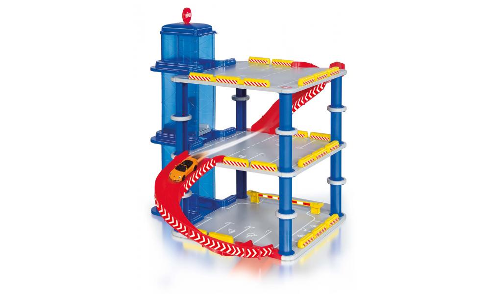 3 patrová garáž nabízí mnoho parkovacích míst. Sada obsahuje oranžové Porsche kabriolet, prostorné skluzavky, očíslované parkovací boxy a výtah. Rozměr garáže: 28 x35,5 x17 cm .