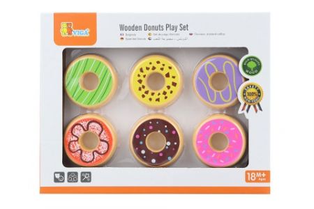 Dřevěné donuty. V balení je celkem 6 donutů různých barev o velikosti cca 5,5 x 5,5 cm. Rozměry balení cca 24,5 x 19 x 3 cm. Věk 18m+